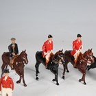 A group of Britains lead hunting figures, including gentleman farmer, two huntsmen at gallop, four at trot, standing figures, hare and five hounds (paint chips).