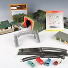 A collection of gauge OO track and accessories, including Hornby station sections, Gaugemaster grey ballast underlay, plastic buildings, track, model cars and commercial vehicles.