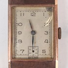 A 9ct gold rectangular cased gentleman’s wristwatch, the unsigned jewelled movement detailed ‘Swiss made 15 jewels’, the unsigned rectangular silvered dial with black Arabic numerals and subsidiary seconds, London 1947, total weight 16.3g, case width 2.1cm, together with a 9ct gold circular cased lady’s wristwatch, the unsigned silvered dial with black Arabic numerals, total weight 12.7g, case diameter 2.5cm.