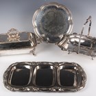 A group of plated items, including a meat dome, initial engraved, with detachable beaded handle, a four-piece tea set, an entrée dish, stand and cover with detachable handle, and a sauceboat.