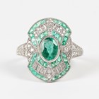 A platinum, emerald and diamond ring in an Art Deco panel shaped design, the principal oval cut emerald mounted at the centre, detailed ‘850 Plat’, weight 5.4g, principal emerald weight approx 0.69ct, ring size approx N.