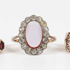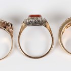 A gold, opal and garnet five stone ring, marks rubbed, weight 2.8g, ring size approx N, a 9ct gold and colourless cubic zirconia ring, weight 5.1g, and a gold and silver, sardonyx and colourless gem set oval cluster ring, detailed ‘9ct & Sil’, weight 2.3g.