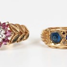 An Edwardian 18ct gold and blue gem set three stone ring, Birmingham 1904, weight 2.8g, ring size approx M, and a 9ct gold, ruby and diamond nine stone cluster ring with foliate pierced shoulders, London 1991, weight 2.5g, ring size approx K.