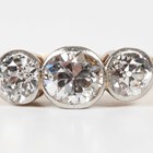 A gold and diamond three stone ring, collet set with a row of circular cut diamonds, detailed ‘18ct’, weight 2.6g, total diamond weight approx 1.40-1.50ct, ring size approx N1/2.