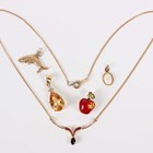 A gold and sapphire single stone necklace, detailed ‘585’, on a gilt metal boltring clasp, weight 2.9g, length 39.5cm, a gold, diamond and citrine pendant, detailed ‘18K VC’, weight 2.6g, a gold and enamelled pendant, designed as an apple, detailed ‘375 Italy’, weight 1.1g, an opal single stone pendant and a gold charm, designed as a fish, indistinct mark, weight 0.4g.