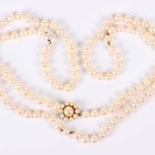 A single row necklace of uniform cultured pearls on a 9ct gold and cultured pearl cluster clasp, maximum length 98cm. Note: the necklace is constructed of four separate strands of cultured pearls allowing for varying lengths of necklace to be worn.