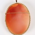A gold mounted oval shell cameo pendant brooch, carved as a portrait of a girl with a bird, signed ‘Deri’, detailed ‘18kt Italy’, weight 18.8g, length 6.2cm, with a case.