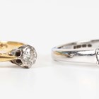 An 18ct gold and diamond single stone ring, mounted with a circular cut diamond, London 1967, weight 1.8g, ring size approx L, and a 9ct white gold and diamond five stone ring, mounted with circular cut diamonds, weight 2.7g, ring size approx M.