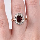 An 18ct gold, ruby and diamond oval cluster ring, claw set with the oval cut ruby within a surround of circular cut diamonds, London 1975, ruby dimensions approx 7.4mm x 6mm x 3.5mm, ring size approx J.