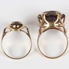 A gold ring, claw set with an oval cut pale smoky quartz between lobed sides, detailed ‘585’, weight 4.7g, ring size approx L1/2, and another gold ring, claw set with a large oval cut smoky quartz, detailed ‘9ct’, weight 6.2g, ring size approx N.