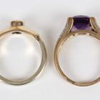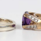 A 9ct gold, amethyst and diamond ring, claw set with the cushion shaped amethyst between diamond set ‘V’ shaped shoulders, Sheffield 2002, ring size approx M1/2, and a 9ct two colour gold ring, collet set with a circular cut pink gemstone, London 2001, ring size approx L1/2, total weight 8.4g.
