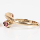 A 9ct gold signet style ring, collet set with an oval cut dyed green chalcedony, Birmingham 1975, ring size approx E1/2, a 9ct gold signet ring, a 9ct gold and mauve gem set two stone ring, a 9ct gold and colourless gem set ring, total weight 7.3g, and another ring, claw set with a blue zircon.