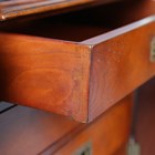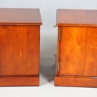 A pair of modern cherry campaign style bedside chests of four drawers, each with recessed brass handles flanked by Wellington style locking plates, height 62cm, width 56cm, depth 43cm.