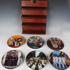 A group of modern Beatles memorabilia, including eight Bairstow Manor Collectables 'Legends of Rock & Roll' porcelain character jugs and a set of Franklin Mint porcelain music boxes, with display shelf.