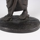 A Japanese brown patinated bronze figure of a bijin musician, Meiji/Taisho period, modelled standing wearing a long robe and holding a samizen, on an oval base, cast signature seal mark to back of base, height 42cm.