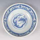 A Japanese blue and white porcelain circular bowl, Meiji period, painted in the Chinese style, the interior with a dragon roundel beneath a rim of Long Elizas and fence, the exterior with the eight horses of Muwang, underglaze blue mark to base, height 8.4cm, diameter 24cm.