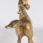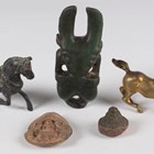 A small group of South-east Asian collectors' items, comprising a Chinese bronze horse, height 4.8cm, a similar gilt horse, height 4.5cm, a Hongshan type green hardstone carved mask pendant, length 8.1cm, a Thai pottery votive plaque, height 4.3cm, and a Himalayan pottery votive stupa, height 2cm.