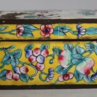 A Chinese Canton enamel rectangular box and cover, early 20th century, the top painted with a scene of a mother and two children above bands of fruit, flowers and scrolls on a yellow ground, length 16cm (minor losses), together with a similar square box and cover, width 7.3cm (badly damaged).