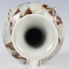 A Chinese porcelain bottle vase, late Qing dynasty, the globular body and flared narrow neck covered in irregular brown, pink and blue glazes on a white ground, height 20.5cm.