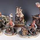 Eleven Capodimonte bisque porcelain figure groups, 20th century, typically modelled, including a cobbler by Mariani, a physician, a tramp on a bench feeding birds by Natale, a pony and trap by Cortese and a boy with a scythe by Cortese (some faults).