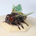 A Dennis China Works small jar and cover, dated 2003, designed by Sally Tuffin, decorated with elephants against a shaded orange ground, the cover with elephant finial, impressed and painted marks to base, height 11.5cm, together with a similar jar and cover with honeycomb pattern and bee finial (minor faults).