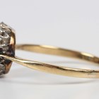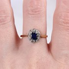 A gold, sapphire and diamond oval cluster ring, mounted with a cut cornered rectangular step cut sapphire within a surround of single cut diamonds, detailed ‘18ct P’, weight 2.4g, ring size approx P, with a case.