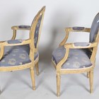 A pair of late 19th/early 20th century grey painted showframe fauteuil armchairs, upholstered in patterned blue damask, height 87cm, width 57cm, depth 54cm.