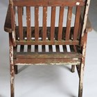 A 20th century slatted wooden garden suite, comprising two benches, width 118cm, a pair of armchairs and a rectangular table, length 150cm (some faults and wear).