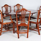 A modern George III style mahogany oval dining table by William Tillman, height 72cm, length 154cm, depth 112cm, together with a set of six dining chairs and a sideboard by William Tillman, height 90cm, width 155cm.