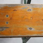 A mid-20th century French pine and metal trestle table, height 76cm, length 200cm, depth 50cm, together with a pair of matching benches.