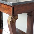 An early 20th century French Empire style mahogany and gilt metal mounted console table with a grey marble top and a single drawer, height 86cm, width 98cm, depth 43cm.