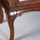 An Edwardian mahogany and chequer banded display cabinet with arched top and mirrored open shelf, height 202cm, width 143cm, depth 40cm.