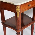 A pair of mid-20th century French Neoclassical Revival mahogany and gilt metal mounted bedside cabinets with shaped marble tops, height 82cm, width 46cm, depth 32cm.