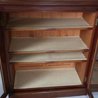 A good mid-Victorian mahogany dwarf library bookcase, fitted with a central bank of seven drawers, flanked by a pair of glazed cabinets with carved foliate mouldings, height 112cm, width 214cm, depth 44cm.