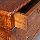 A pair of late 20th century French marquetry inlaid three-drawer commodes, decorated with overall rosettes and scrolls, height 88cm, width 129cm, depth 54cm.