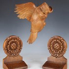 A 20th century carved wooden hanging model of an owl, height 28cm, together with a pair of 20th century carved wooden Tudor rose bookends, height 19.5cm.