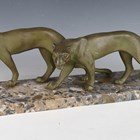 An Art Deco green patinated cast spelter model group of two leopards, raised on a marble base, width 70cm.