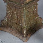A 19th century cast iron garden urn of campana form, raised on an associated palmette and scroll decorated pedestal, height 80cm, diameter 38.5cm.