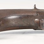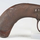 A fine early 19th century percussion belt or overcoat pistol by Wilkinson & Son, London, with octagonal steel barrel, barrel length 10cm, foliate engraved steel lock and hammer, sliding safety, belt clip, pull-out swing-over steel captive ramrod and finely chequered carved wood grip with inset silver cartouche and steel butt plate with hinged trapdoor (action works at half and full cock).