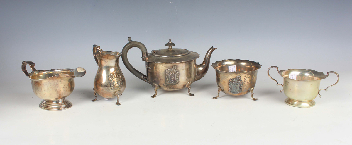 A George V silver three-piece bachelor's tea set, each piece applied with the coat of arms for the Worshipful Company of Founders, comprising teapot, sugar bowl and milk jug, Sheffield 1929, 1930 and 1931 by James Dixon & Sons Ltd, together with a silver sauceboat and a silver two-handled sugar bowl, various dates and makers, total weight 1061.1g.