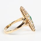 A gold, emerald and diamond marquise shaped cluster ring, mounted with three rectangular cut emeralds within a surround of cushion shaped diamonds, detailed ‘18ct’, weight 3.7g, ring size approx J1/2.