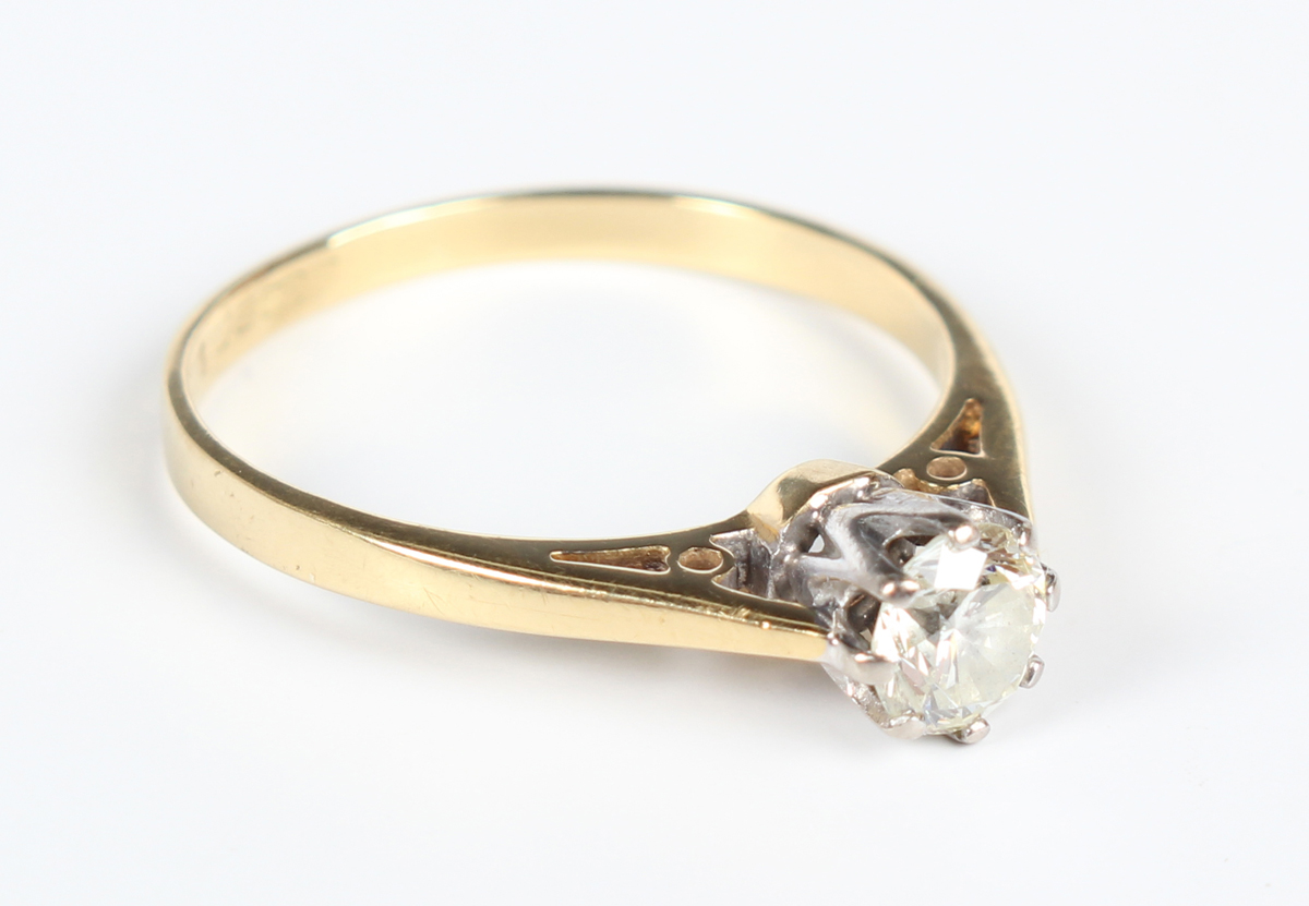 An 18ct gold and diamond single stone ring, claw set with a circular cut diamond, weight 1.8g, ring size approx K.