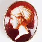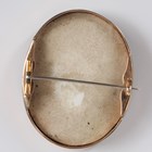A gold mounted oval porcelain brooch, painted with a profile bust portrait of a classical lady, unmarked, width 3.5cm, length 4.4cm.
