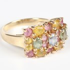 A 9ct gold and varicoloured gemstone set panel shaped ring, weight 4.6g, ring size approx L.