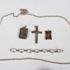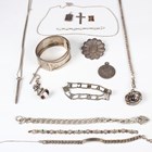 A Victorian silver oval hinged bangle with engraved floral and foliate decoration, Birmingham 1883, inside width 5.3cm, with a case, a silver curblink Albert chain, fitted with two agate fobs, length of chain 45.5cm, two silver bracelets, another bracelet, detailed ‘REMEMBRANCE’, a mosaic bracelet, a Russian medal and further items.