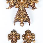 A gold, mounted tortoiseshell and half-pearl pendant brooch, designed as a cross with filigree decoration, length 6.2cm, width 4.7cm, a pair of earring drops of similar design (fittings lacking), length 4.7cm, and an oval shell cameo brooch, carved as a portrait of an angel, width 4.3cm, fitted with a safety chain.