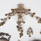 A group of jewellery, comprising a sapphire and half-pearl brooch, width 3.3cm, a Norwegian heart shaped brooch with filigree pendant drops and coronet surmount, detailed '830', length 11.3cm, a pair of similar drops, three further brooches and four further items.