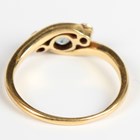 A 15ct gold and pale blue gem set single stone bar brooch, detailed '15ct', weight 2.8g, width 5.5cm, and a gold, diamond and pale blue zircon three stone ring in a crossover design, indistinct mark, weight 2.2g, ring size approx K.