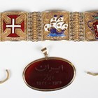 A gold mounted cornelian oval pendant with incised Arabic script, indistinct mark, length 6.1cm, a gold, ruby and diamond ring (damaged), weight 3g, and a Portuguese silver gilt and enamelled bracelet, the curved square filigree panels decorated with ships, cross and armorial, length 21.5cm.