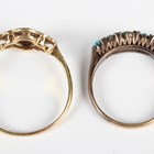 A gold, platinum and diamond cluster ring, mounted with eight circular cut diamonds, detailed ‘18ct Plat’, ring size approx R, and a turquoise five stone ring with pairs of diamond points at intervals, detailed ‘18’, ring size approx L, total weight 4.9g.